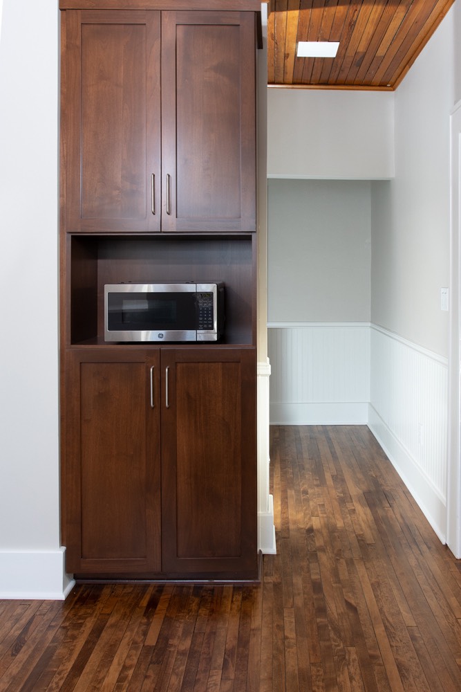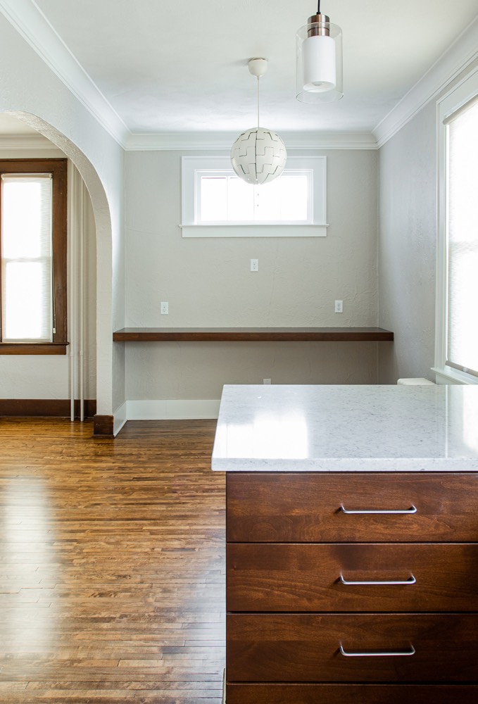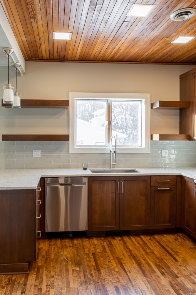 Clean kitchen redesign with white walls and wood accents - Fargo, ND.